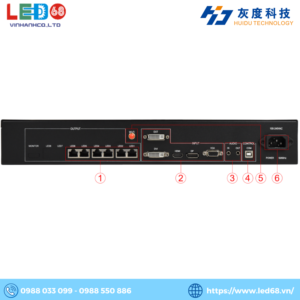 Bộ xử lý cung cấp 6 cổng mạng Gigabit để truyền tín hiệu trực tiếp đến thẻ nhận, giúp hiển thị nội dung trên màn hình LED một cách chính xác và ổn định. Các thông số đầu ra tối ưu: