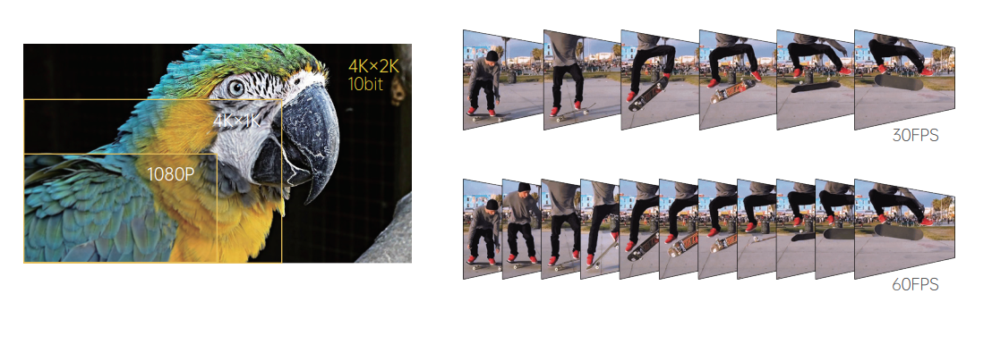 Dòng H đạt được 4K thực sự (4K × 2K@60Hz, RGB 4:4:4, 10bit) cho thu thập, xử lý và đầu ra tín hiệu. Để hiển thị siêu cao độ phân giải. Tín hiệu đầu vào và đầu ra hỗ trợ xử lý mượt mà 60FPS mà không có giật hoặc mất khung hình, hoàn toàn thể hiện chi tiết hình ảnh.