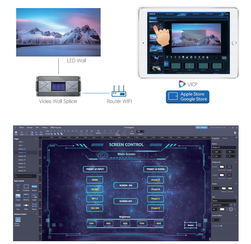 VICP là một ứng dụng điều khiển thông minh, có thể được sử dụng để điều khiển dòng H, như chuyển đổi tín hiệu truy cập, chuyển đổi thiết lập trước, điều chỉnh độ sáng màn hình, v.v. Một giao diện điều khiển mới cũng có thể được tạo ra cho VICP thông qua trình biên tập trang VI Designer để điều khiển các sản phẩm dòng H. Sắp xếp nút đơn giản có thể giúp khách hàng chuyển đổi đầu vào hoặc thiết lập trước, điều chỉnh độ sáng và hoàn tất các hoạt động cơ bản hàng ngày nhanh chóng hơn.