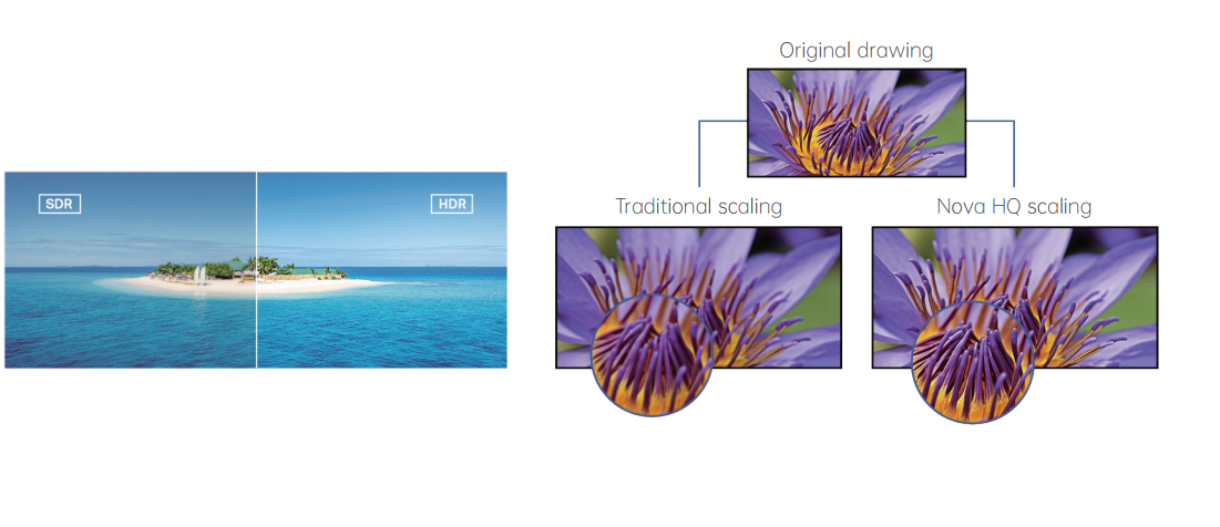 Dòng H tích hợp bộ xử lý hình ảnh HD, hỗ trợ HDR, truyền tải dải màu rộng, độ tương phản cao và màu sắc phong phú, cung cấp nhiều chi tiết hơn cả trong ánh sáng và bóng tối. Công nghệ tỉ lệ màn hình chất lượng cao Nova HQ của NovaStar, bao gồm một bộ xử lý tỉ lệ nội dung thích ứng. Công nghệ này ngăn chặn mất chi tiết và lỗi biên khi thu nhỏ, cũng như các rìa gạch và làm mờ khi phóng to, cho phép khôi phục hoàn hảo hình ảnh ban đầu.