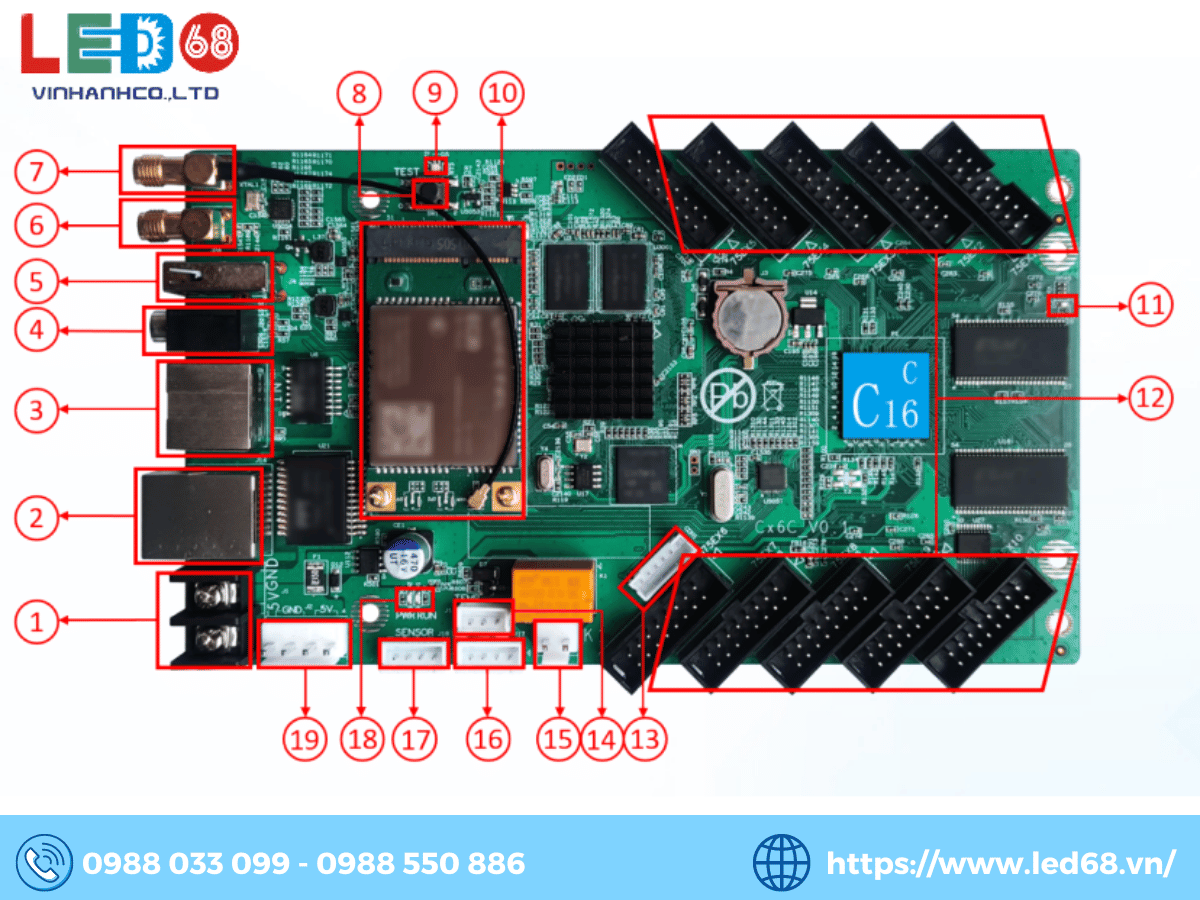 Mô tả - ghi chú các vị trí trên mạch điều khiển led ma trận wifi Huidu HD-C16c