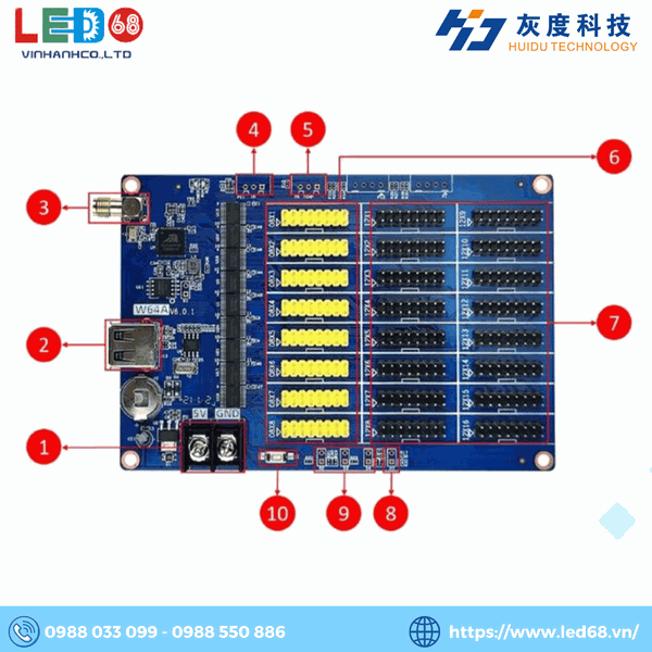 Card điều khiển LED HD-W64A của Shenzhen Huidu Technology Co., Ltd là một giải pháp điều khiển LED ma trận WiFi tích hợp cổng USB, được sử dụng rộng rãi trong các ứng dụng như màn hình biểu ngữ LED, biển hiệu cửa hàng, màn hình thông báo ngân hàng và các màn hình thông tin cộng đồng công cộng