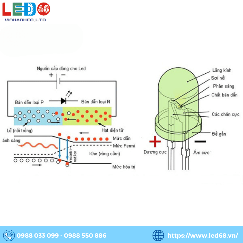 Tái hợp electron và lỗ trống: Khi các electron từ lớp bán dẫn N gặp các lỗ trống ở lớp bán dẫn P, chúng sẽ tái hợp với nhau. Quá trình này giải phóng năng lượng dưới dạng photon – đây chính là ánh sáng mà chúng ta thấy.