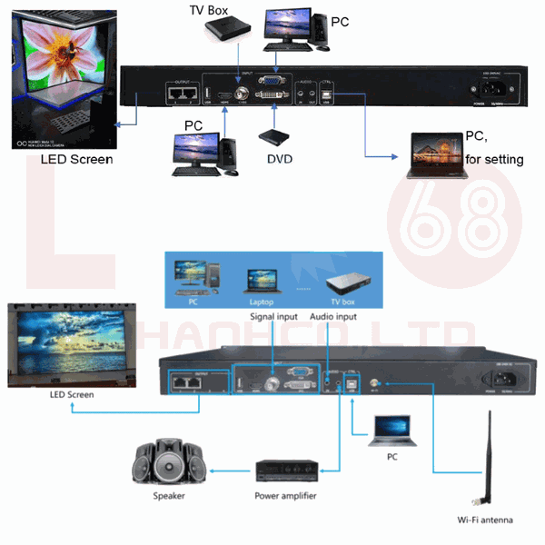 Mặt sau bao gồm: Cổng kết nối đến màn hình LED, các ngõ vào tín hiệu, jack âm thanh, ngõ vào điều khiển từ máy tính, jack cắm ăngten Wi-Fi, và ngõ vào AC 220V.