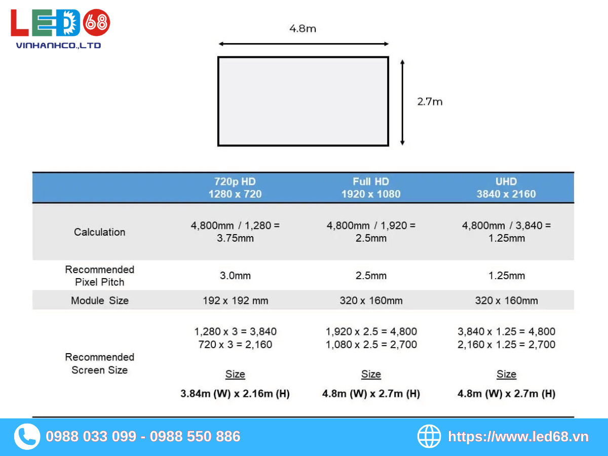 Như vậy, LED68 đã hướng dẫn bạn cách tính toán kích thước màn hình LED, giúp bạn lựa chọn cấu hình phù hợp, tối ưu chi phí và đảm bảo hiển thị tốt nhất.
