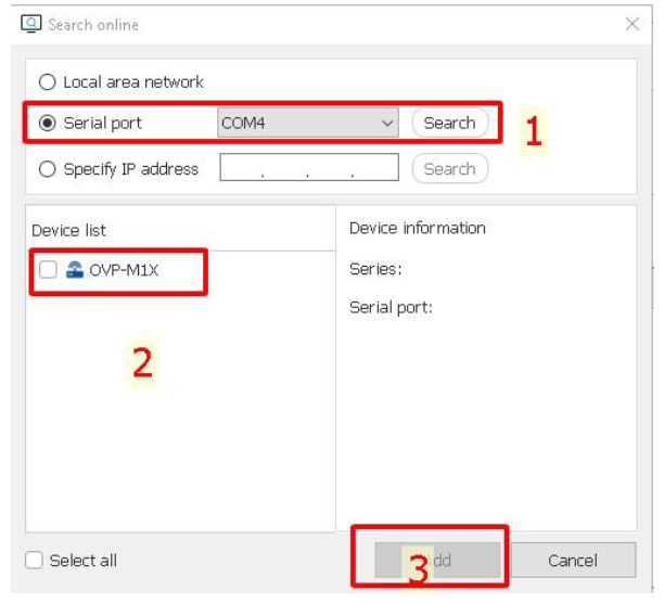 - Tại tab Search Online, chọn "serial port", chọn cổng COM sau đó click "Search"