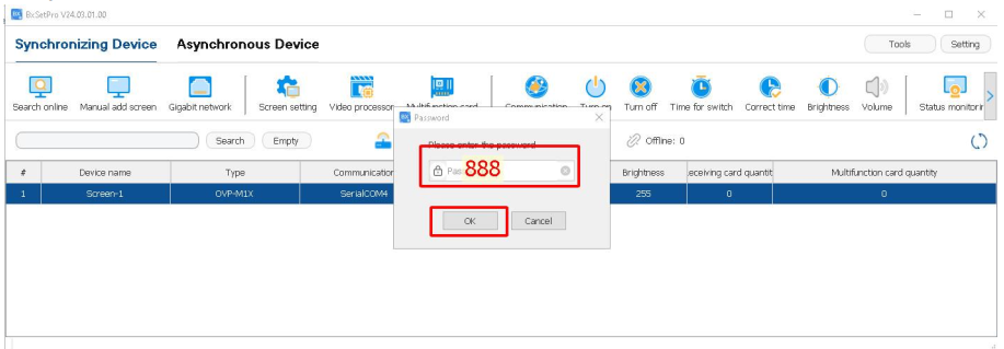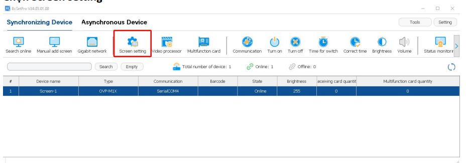 - Cài đặt màn hình, tại tab Synchronizing Device (giao diện phần mềm BxSetPro), chọn "Screen settings"