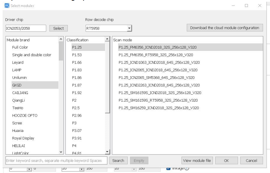 + Chọn pixel pitch của module (P1.25, P1.53, P1.66,...)