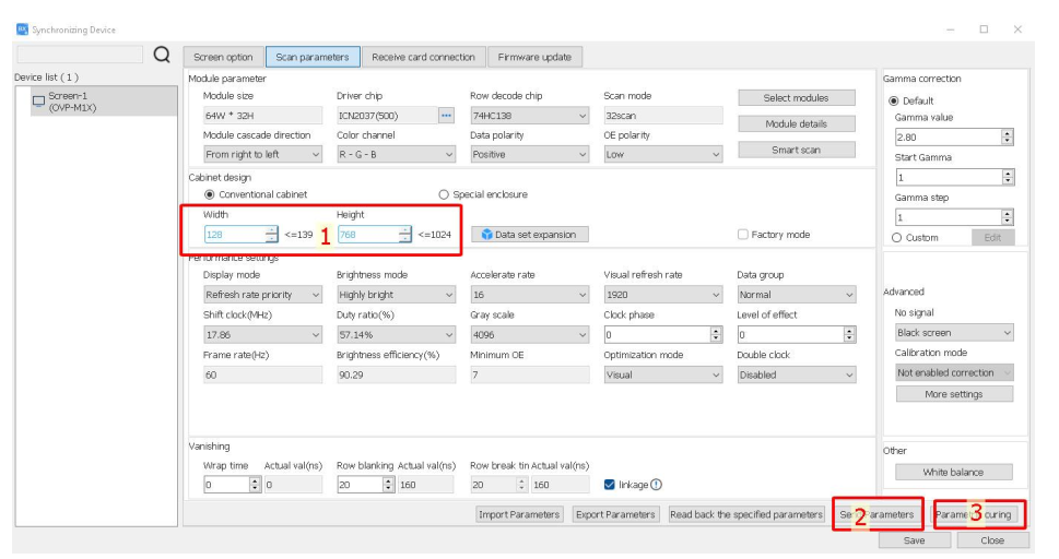 - Cài đặt kích thước cho 1 card thu (trong hình minh họa là độ phân giải theo tấm P2.5(W*H: 120x64): cao 12 tấm x rộng 1 tấm).