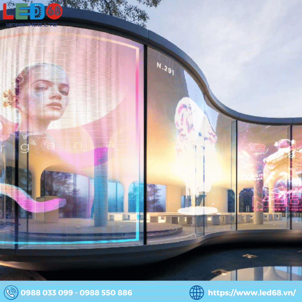 Tích hợp vào mặt tiền kính và các bề mặt kính cong để tạo hiệu ứng ánh sáng và hình ảnh động, tăng cường giá trị thẩm mỹ và thu hút sự chú ý.