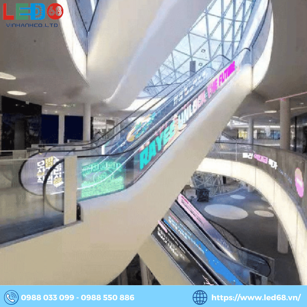 - Hiển thị trạng thái hoạt động của thang cuốn: Màn hình LED trong suốt có thể được sử dụng để hiển thị trạng thái hoạt động của thang cuốn, chẳng hạn như tốc độ di chuyển, tầng hiện tại, tầng dừng và các thông tin khác.