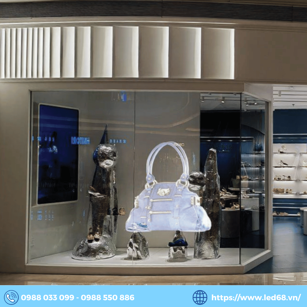 - Trưng bày sản phẩm cửa hàng: Màn hình LED trong suốt có thể được sử dụng để hiển thị thông tin sản phẩm và các chương trình khuyến mãi của cửa hàng, nhằm thu hút sự chú ý của khách hàng.