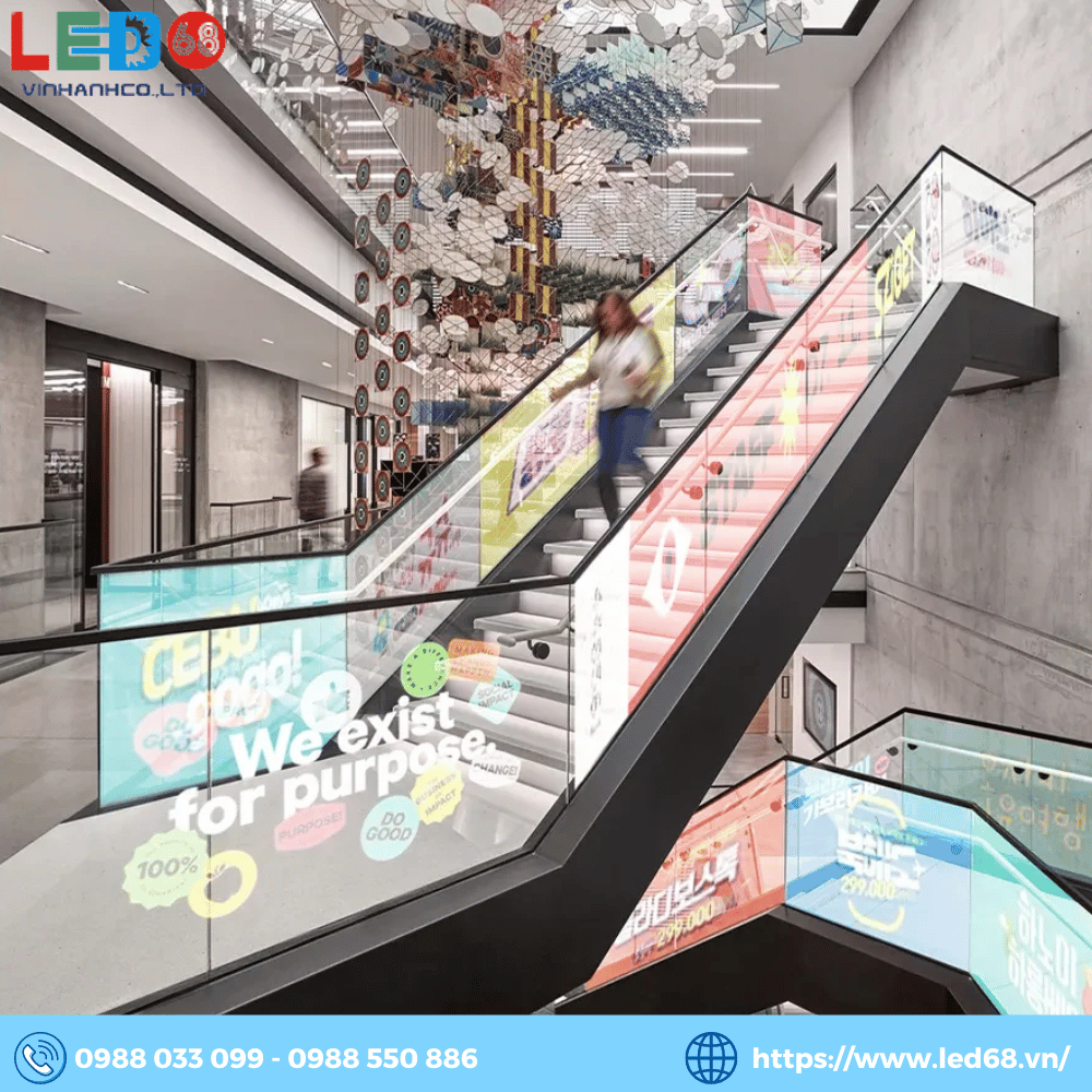 Ngoài ra, trong các trung tâm thương mại, màn hình LED trong suốt có thể được lắp đặt trên lan can kính để thu hút sự chú ý của khách hàng và nâng cao hình ảnh thương hiệu. Chúng tôi đề xuất một giải pháp sử dụng màn hình LED trong suốt trên lan can kính của trung tâm thương mại. Giải pháp này sử dụng màn hình LED trong suốt được gắn trên lan can kính để hiển thị thông điệp quảng cáo và thu hút sự chú ý của khách hàng mà không chiếm nhiều diện tích.
