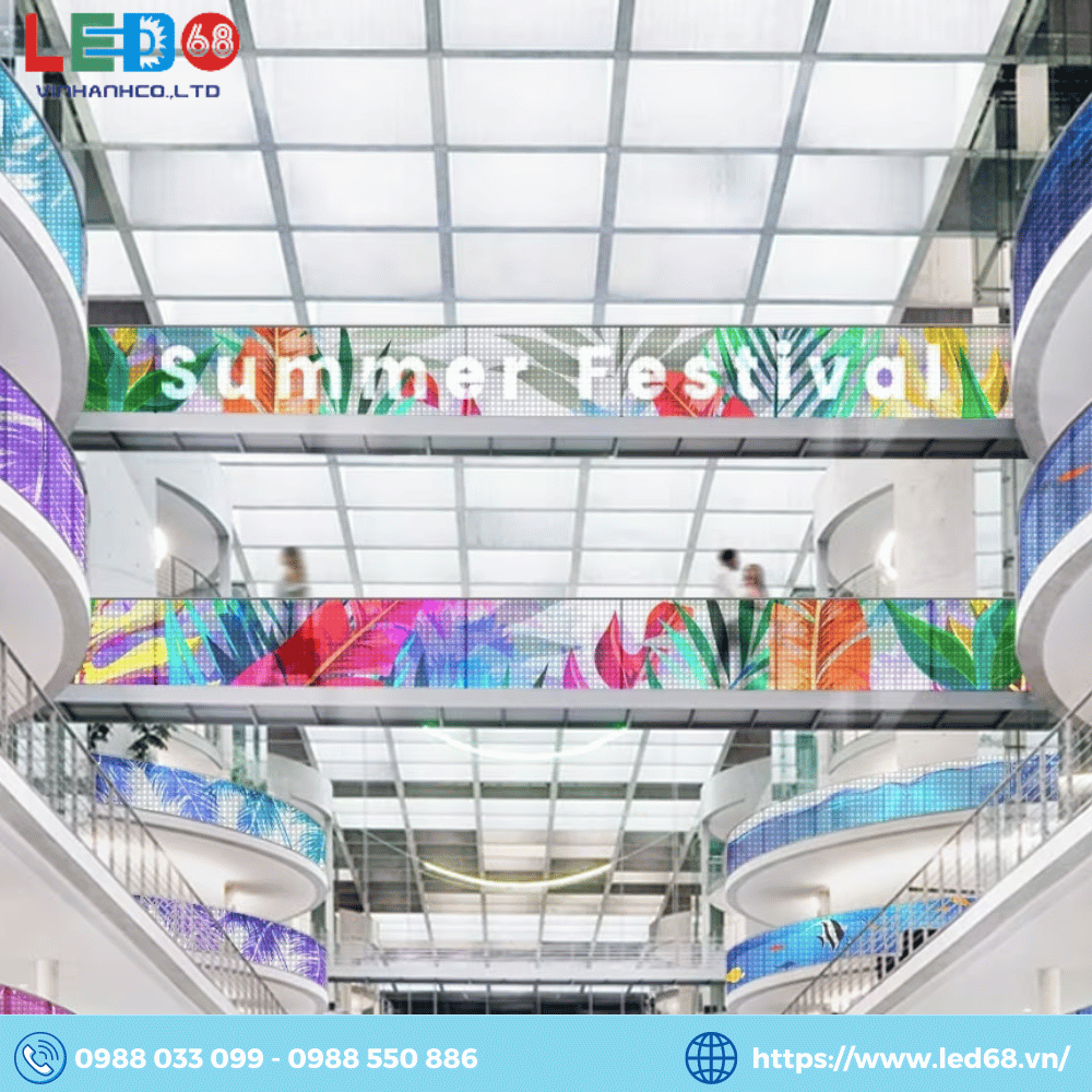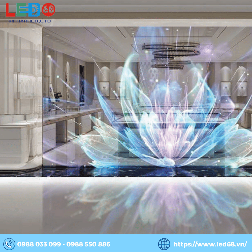 Màn hình LED trong suốt tường kính có thể hiển thị nội dung thông qua hình ảnh, video nghệ thuật, giúp tạo ra điểm nhấn nổi bật và thu hút sự chú ý trong không gian thiết kế.