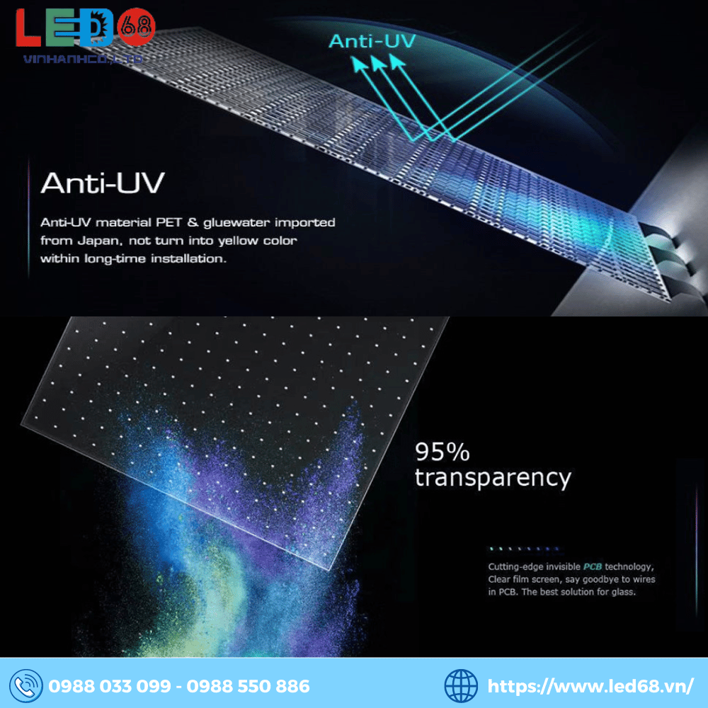 Màn hình LED trong suốt tường kính được phủ lớp chống tia UV, giảm thiểu hiện tượng lão hóa và ố vàng của sản phẩm từ PET, đồng thời bảo vệ sức khỏe thị giác của người sử dụng.
