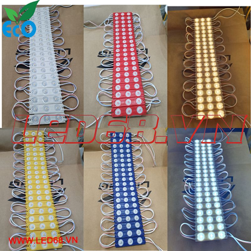 Hiện nay LED68 có phân phối các module LED hắt 3 mắt siêu sáng ECOLED nhiều màu: đỏ, lam, lục, trắng, tím, vàng nắng, vàng đậm,…